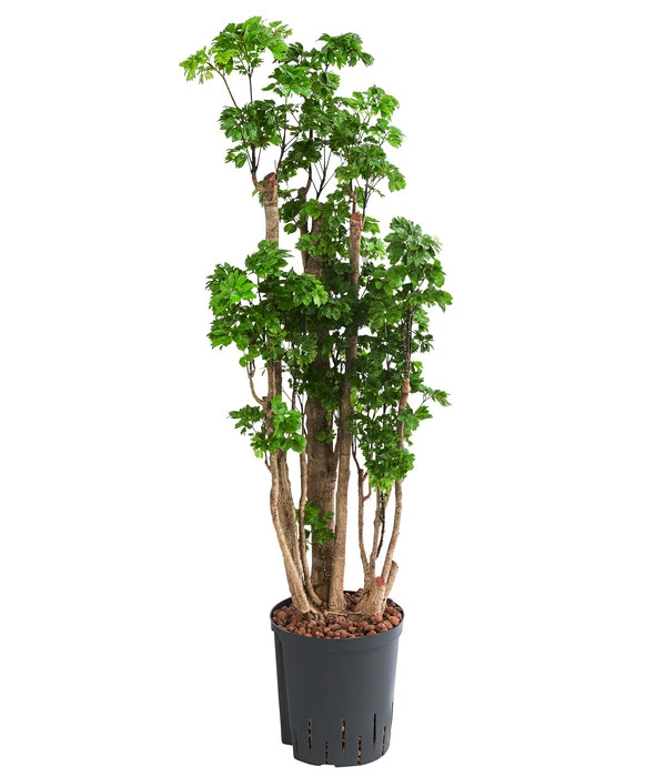 Aufrecht recken sich die zahlreichen Triebe empor, an denen viele gefiederte Blätter in sattem Hellgrün leuchten – man kann sich gut vorstellen, wie diese stattlichen Pflanzen in ihrer Heimat in den tropischen Wäldern Polynesiens und Asiens hohe Hecken bilden. Die Funktion als Schattenspender wird auch in den botanischen Namen der Pflanze deutlich, denn das griechische Wort Polyscias bedeutet übersetzt „viel Schatten“. Doch Sie werden an dieser extravaganten Fiederaralie sicherlich in erster Linie den dekorativen Aspekt schätzen, der aus dem Wechselspiel der holzigbraunen Triebe mit dem zierlichen, grünen Blattwerk resultiert. Und weil wir Ihnen diese immergrüne Zimmerpflanze sogar als Hydrokultur anbieten, ist auch die Pflege (fast) ein Kinderspiel. Bereichern Sie Ihr Zuhause mit dem exotischen Südsee-Flair, das die Fiederaralie vom ersten Moment bei Ihnen verbreiten wird.
